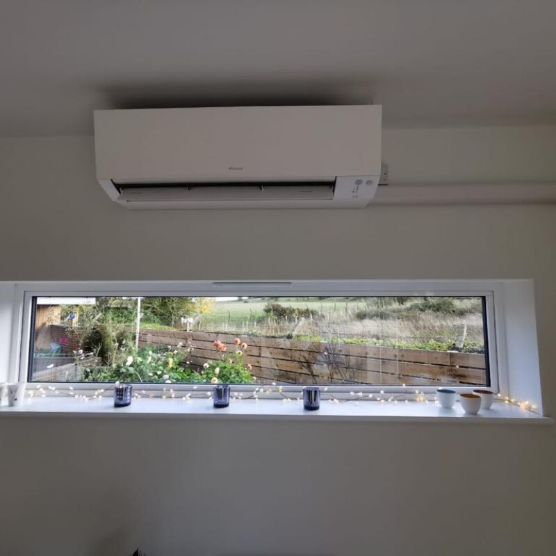 We proposed a Daikin multi split heat pump system with one outdoor unit due to limited external space. A high wall mounted gloss white fan coil in the kitchen/dining room above a window and a discreet low level wall mounted fan coil in the master bedroom were put forward and installed. All external pipework is enclosed in black trunking to match the rain water pipes and the external unit is positioned on a new gravel base at the end of a flower bed.